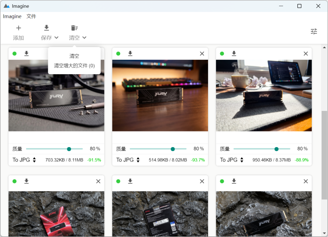然后把想要压缩的图片批量拖进去,Imagine会自动开始压缩图片。等所有图片左上角都有绿色圆点的完成指示后,点击“保存”即可完成。