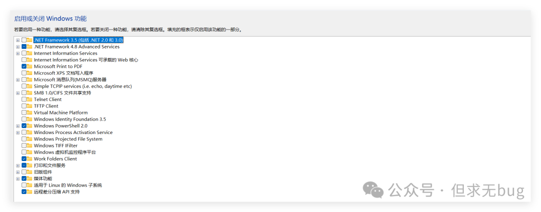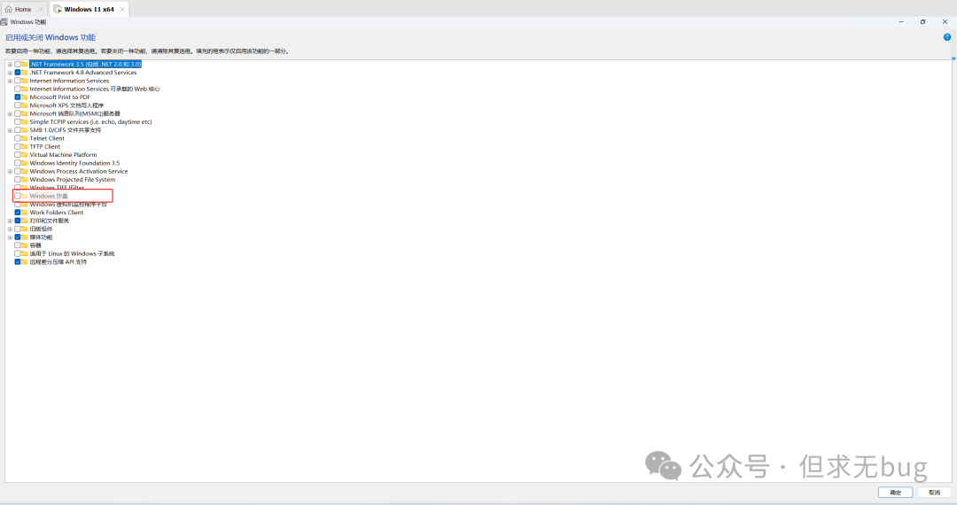打开家庭版的“启用或关闭windows 功能”后如下所示: