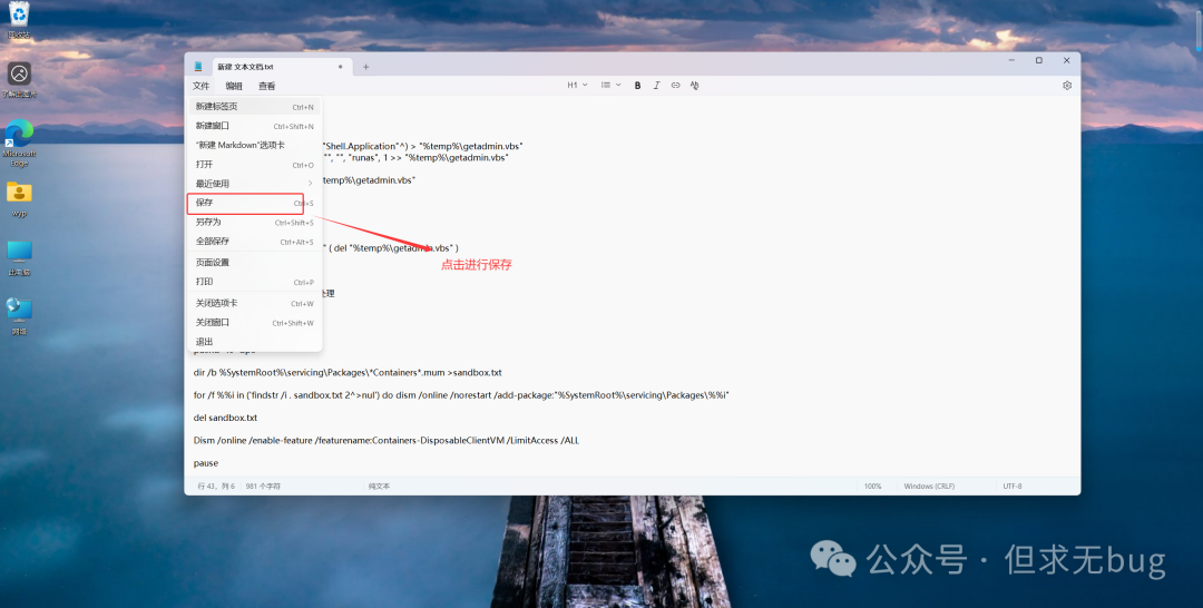 至于这段代码是何含义,本人也不清楚,只知道通过该命令能安装并启用Windows沙盒。粘完毕后需按“Ctrl + S”  或 点击“文件” > "保存"进行保存。