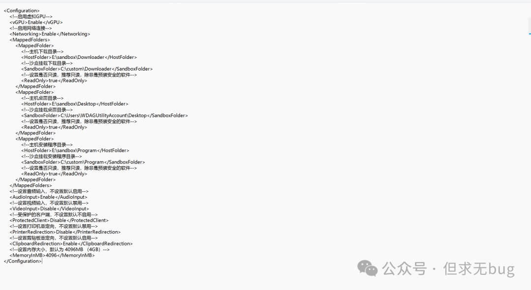 <Configuration>    <!--启用虚拟GPU-->    <vGPU>Enable</vGPU>    <!--启用网络连接-->    <Networking>Enable</Networking>    <MappedFolders>        <MappedFolder>            <!--主机下载目录-->            <HostFolder>E:\sandbox\Downloader</HostFolder>            <!--沙盒挂载下载目录-->            <SandboxFolder>C:\custom\Downloader</SandboxFolder>            <!--设置是否只读,推荐只读,除非是预装安全的软件-->            <ReadOnly>true</ReadOnly>        </MappedFolder>        <MappedFolder>            <!--主机桌面目录-->            <HostFolder>E:\sandbox\Desktop</HostFolder>            <!--沙盒挂载桌面目录-->            <SandboxFolder>C:\Users\WDAGUtilityAccount\Desktop</SandboxFolder>            <!--设置是否只读,推荐只读,除非是预装安全的软件-->            <ReadOnly>true</ReadOnly>        </MappedFolder>        <MappedFolder>            <!--主机安装程序目录-->            <HostFolder>E:\sandbox\Program</HostFolder>            <!--沙盒挂载安装程序目录-->            <SandboxFolder>C:\custom\Program</SandboxFolder>            <!--设置是否只读,推荐只读,除非是预装安全的软件-->            <ReadOnly>true</ReadOnly>        </MappedFolder>    </MappedFolders>    <!--设置音频输入,不设置默认启用-->    <AudioInput>Enable</AudioInput>    <!--设置视频输入,不设置默认禁用-->    <VideoInput>Disable</VideoInput>    <!--受保护的客户端,不设置默认不启用-->    <ProtectedClient>Disable</ProtectedClient>    <!--设置打印机重定向,不设置默认禁用-->    <PrinterRedirection>Disable</PrinterRedirection>    <!--设置剪贴板重定向,不设置默认启用-->    <ClipboardRedirection>Enable</ClipboardRedirection>    <!--设置内存大小,默认为 4096MB (4GB)-->    <MemoryInMB>4096</MemoryInMB></Configuration>