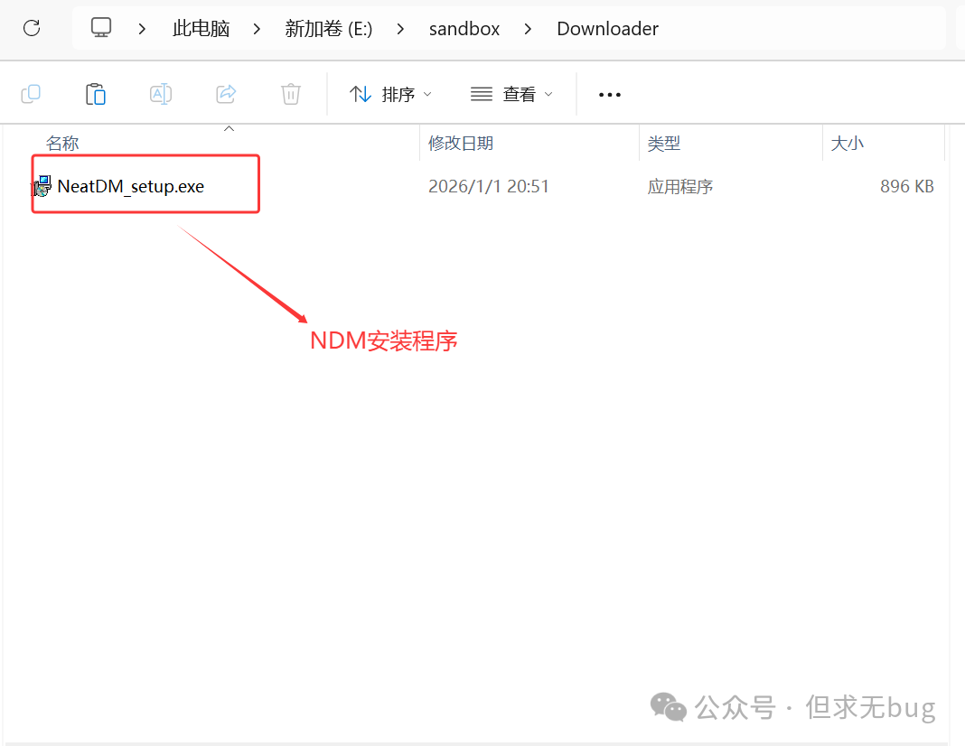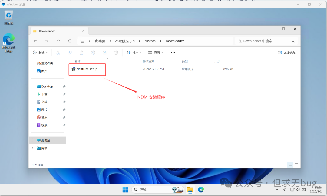 按 Ctrl + S 保存后双击 sandbox.wsb 打开 Windows 沙盒,此时会在 Downloader 目录下发现拷贝的 NDM安装程序: