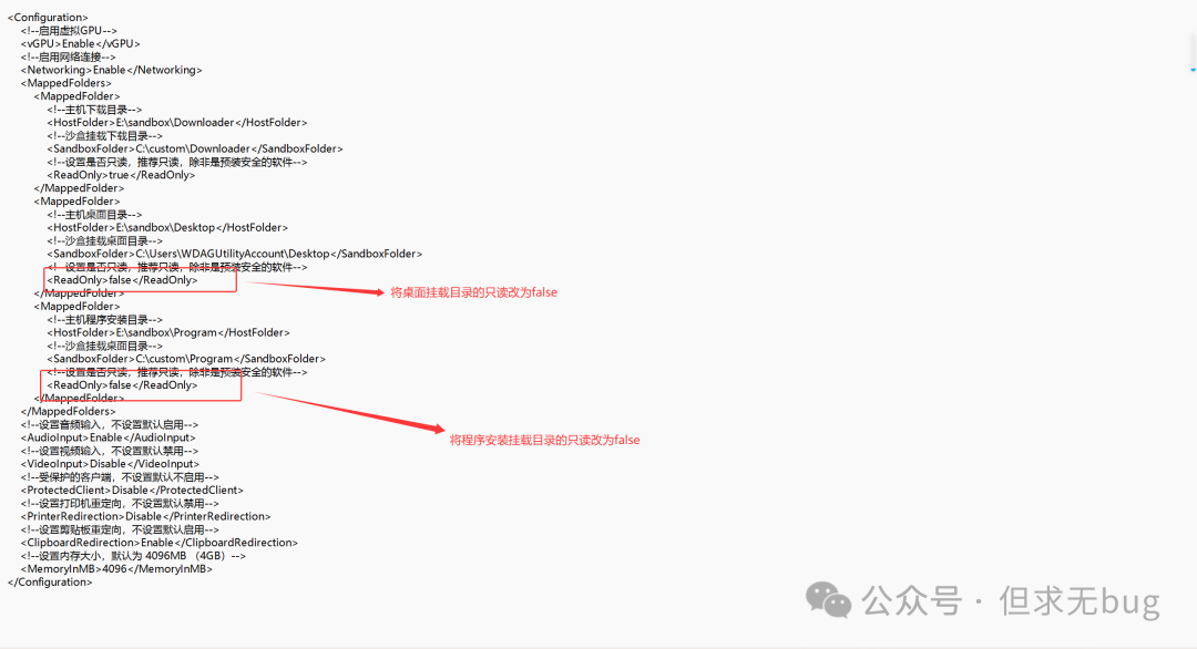 接着修改 sandbox.wsb (用记事本或其他文本软件编辑工具)中关于 Desktop 和 Program 的 ReadOnly 为 false: