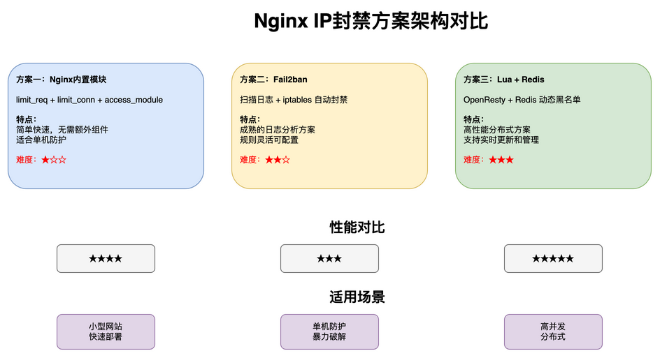 本文将详细介绍三种主流的Nginx动态封禁IP方案,帮助你根据实际场景选择最适合的解决方案。
