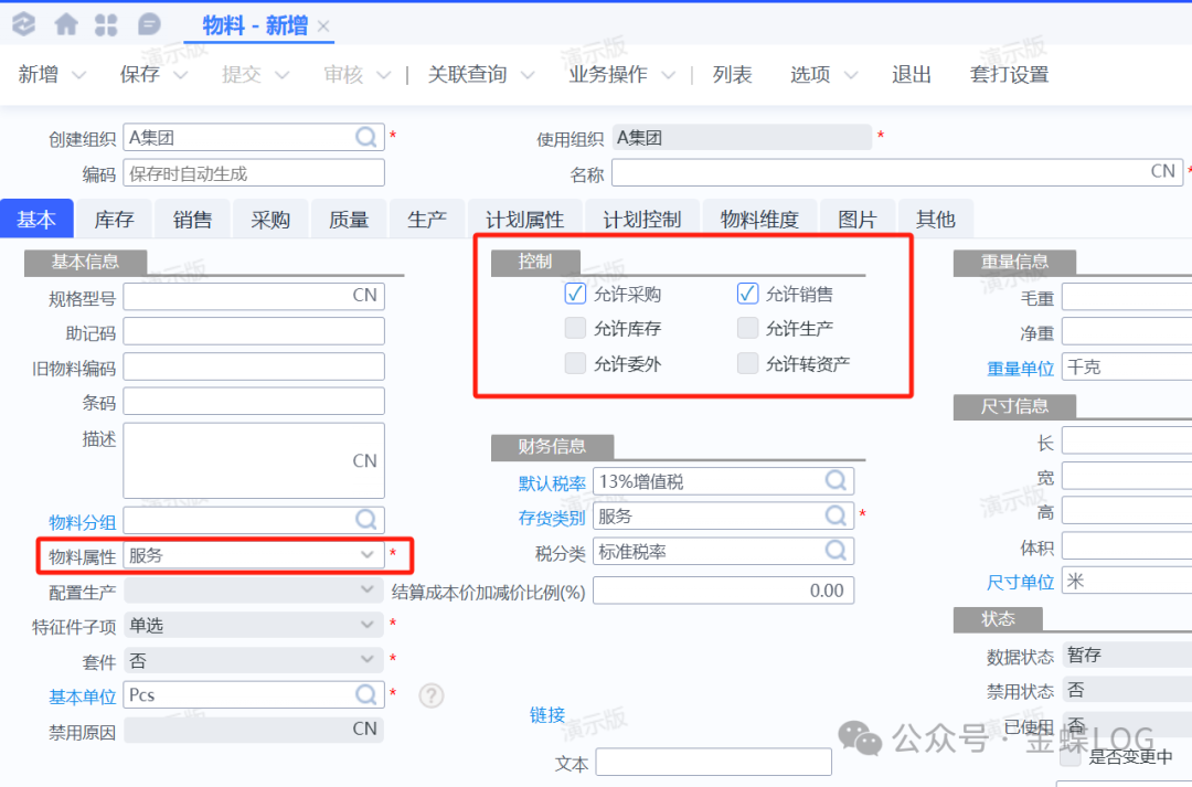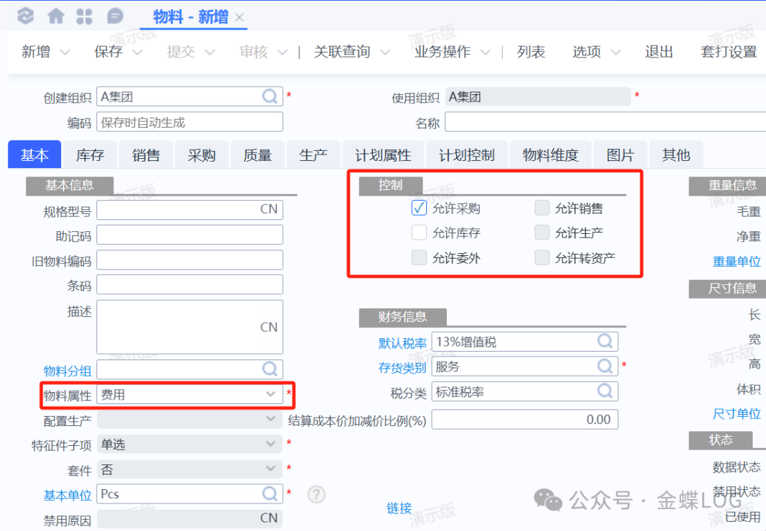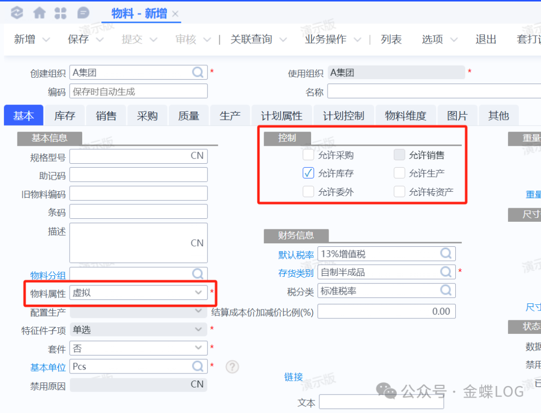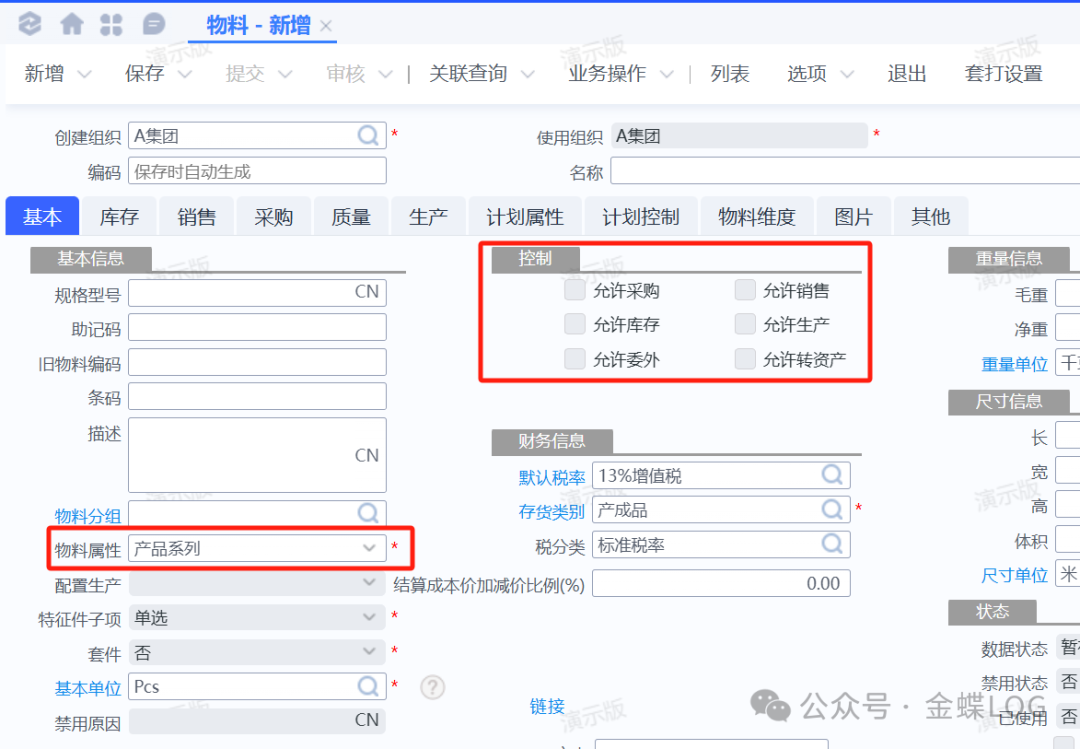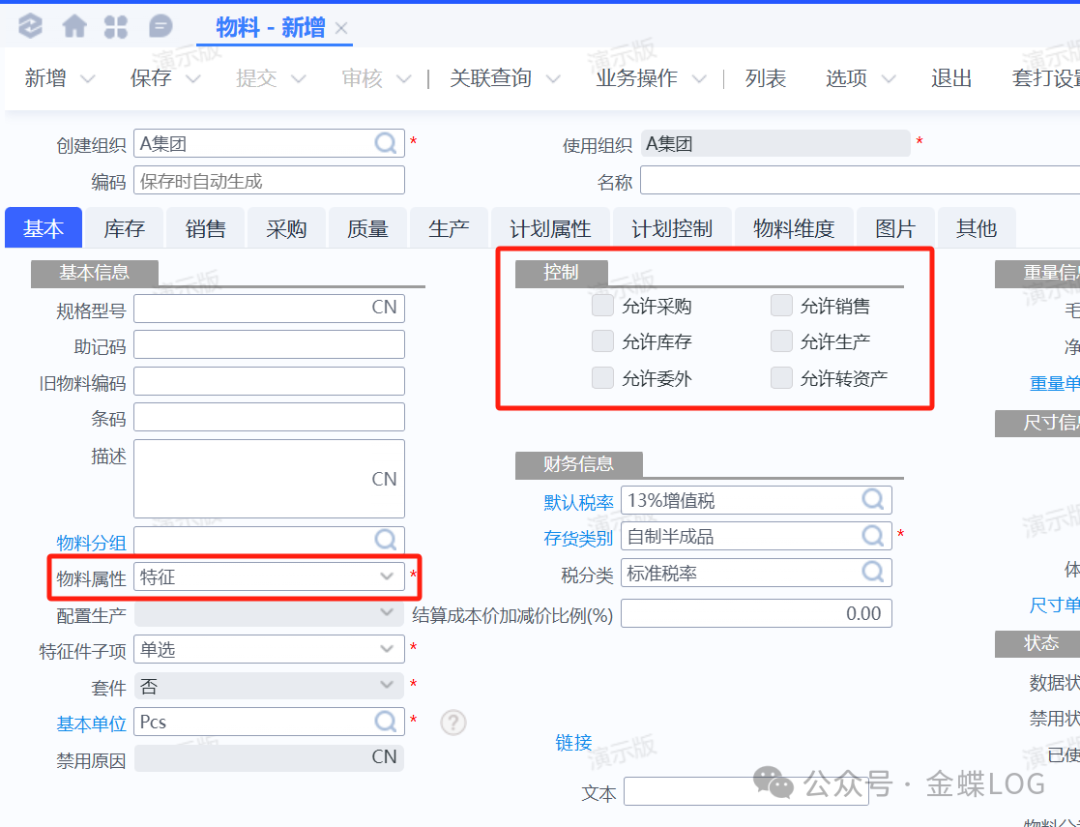 • 控制:默认勾选允许生产、允许销售、允许库存、允许采购。