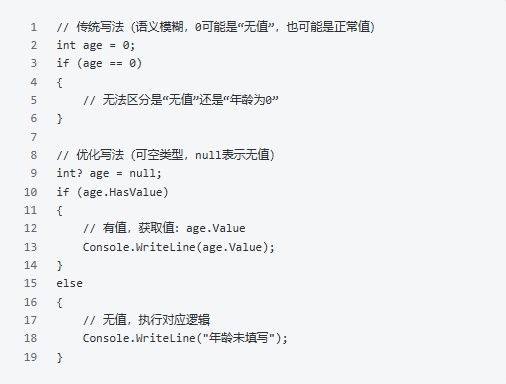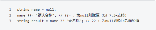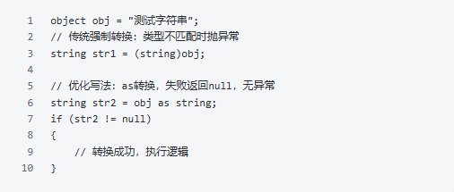 实战中最常见的场景之一:判断变量是否为null,不为null则使用,为null则赋值默认值。传统if判断繁琐,用空合并运算符能一行搞定。注意:?? 和 ??= 不会触发变量的getter/setter,比if判断更高效,且支持所有可空类型(包括值类型可空,如int?、DateTime?)。2. 类型转换:用 as 替代强制转换,避免异常