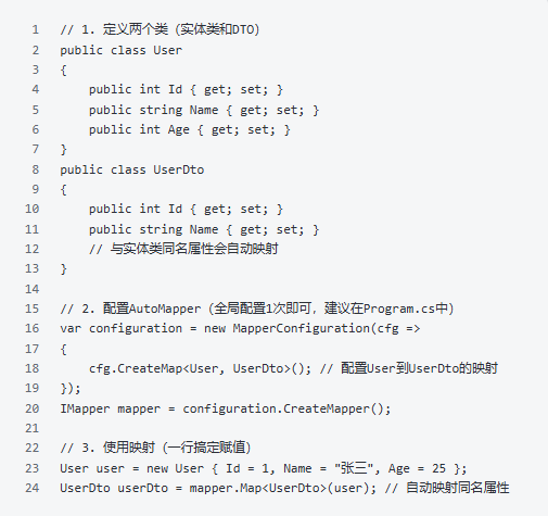 实战中,很多代码会重复编写(如对象赋值、集合遍历、参数校验),掌握这些技巧,能大幅减少重复编码,提升开发速度。1. 对象赋值:用 AutoMapper 替代手动赋值