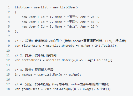 开发中经常需要进行对象转换(如DTO与实体类、ViewModel与实体类),手动赋值繁琐且易出错(漏赋值、赋值错误),AutoMapper能自动映射同名属性,一行搞定。步骤:先安装NuGet包 AutoMapper,再配置映射,最后使用。优势:减少手动赋值代码,避免漏写;支持自定义映射规则(如不同名属性、类型转换),适配复杂场景。2. 集合遍历:用 LINQ 简化遍历、筛选、排序