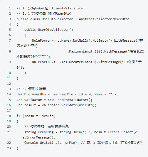 接口开发、方法调用时,需要对参数进行校验(如非空、长度、格式),传统if-else校验逻辑繁琐,代码冗余,用FluentValidation(NuGet包)能简化校验逻辑,且支持自定义校验规则。优势:校验逻辑与业务逻辑分离,代码更简洁;支持链式调用,自定义错误信息,适配各种校验场景(如手机号、邮箱格式)。三、性能优化技巧:避免踩坑,提升程序稳定性
