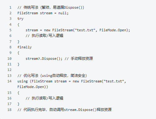 C#中,实现了IDisposable接口的对象(如FileStream、SqlConnection、HttpClient),需要手动释放资源(调用Dispose()方法),否则会造成内存泄漏。传统写法需要try-finally,繁琐且易遗漏;用using语句,会自动调用Dispose()方法,无需手动释放。补充:C#8.0+支持using声明(无需括号),更简洁:using var stream = new FileStream("test.txt", FileMode.Open); ,代码执行到当前作用域结束,自动释放。3. 避免频繁创建对象:用对象池复用