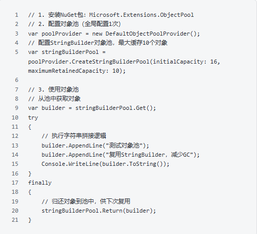高频创建和销毁对象(如循环中创建临时对象、高频接口调用中创建DTO),会增加GC(垃圾回收)压力,导致程序卡顿。对于频繁使用、创建成本高的对象(如StringBuilder、HttpClient),用对象池(ObjectPool)复用对象,减少GC压力。适用场景:频繁创建临时对象、对象创建成本高(如大对象、需要初始化的对象),优先用对象池;简单临时对象(如int、string)无需复用,GC会自动优化。四、异常处理技巧:规范捕获,便于排查