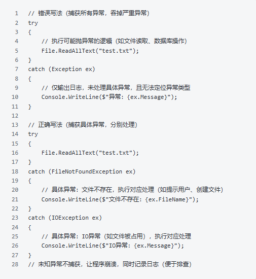很多新手习惯用catch (Exception ex) 捕获所有异常,这样会吞掉一些严重异常(如OutOfMemoryException、StackOverflowException),导致问题难以定位。正确的做法是:只捕获具体的异常类型,对于未知异常,不捕获,让程序崩溃并记录日志,便于排查。2. 异常日志:记录完整异常信息,便于排查