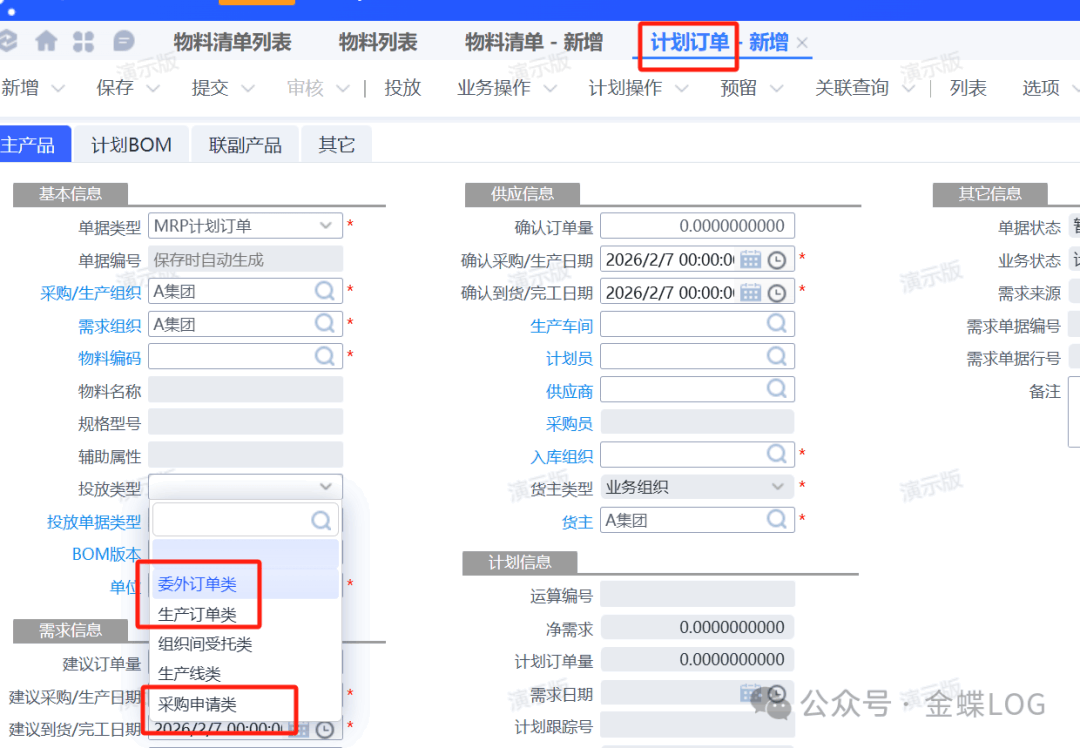 供应类型字段是连接产品设计(BOM)与供应链执行(订单)的桥梁。它的正确设置,确保了计划运算能够按照企业真实的供应链策略,产生对应的【投放类型】单据。