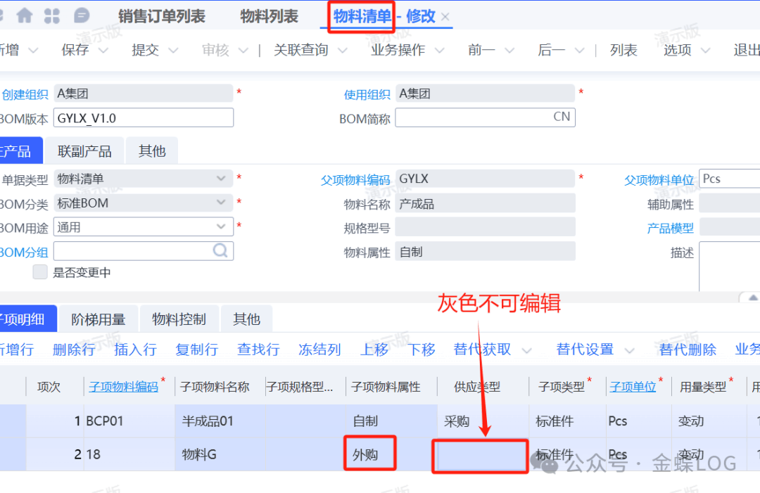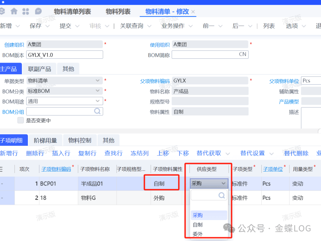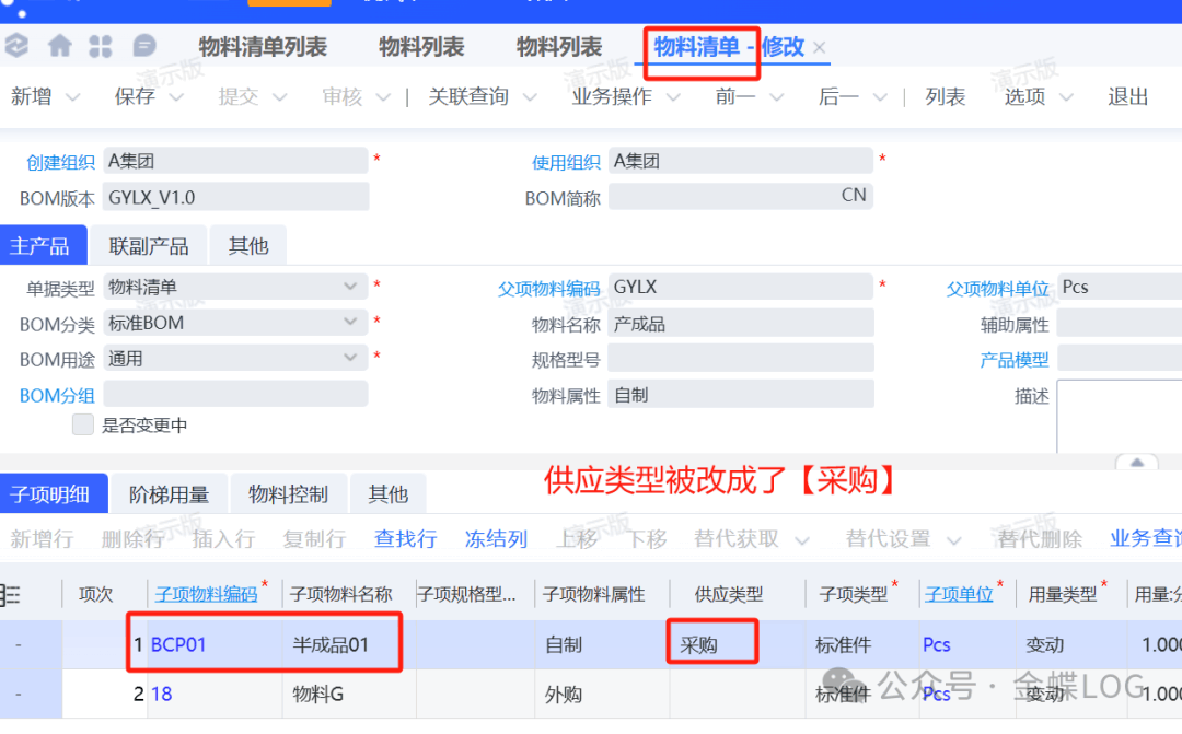 该功能最主要、最实用的场景是:在BOM中,将子项物料的【供应类型】从其默认的【自制】或【委外】,手动更改为【采购】