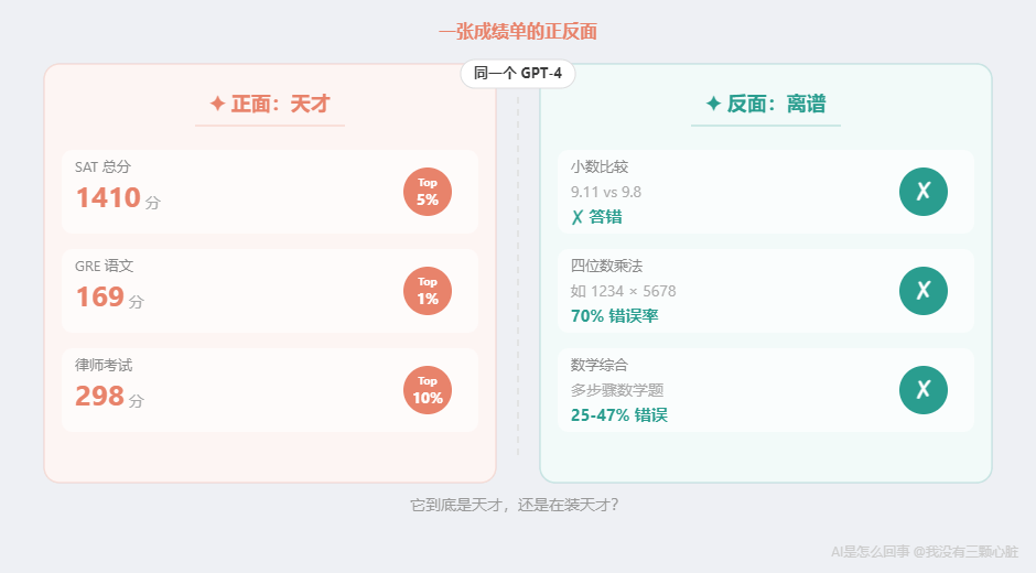 为什么?因为 AI 的每一项能力,都是从那个特定领域的训练数据中学来的。律师考试的能力来自海量法律文本中的问答模式。小数比较的"能力"来自——这个我们下面说。
