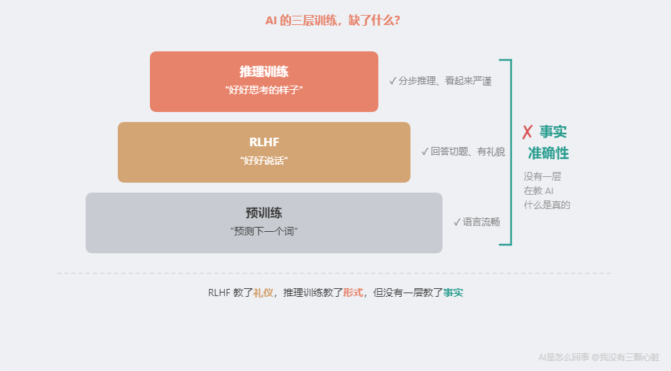 RLHF 教会了 AI "好好说话"。推理训练教会了 AI "好好思考的样子"。但两者都没有教会 AI 什么是"事实"。