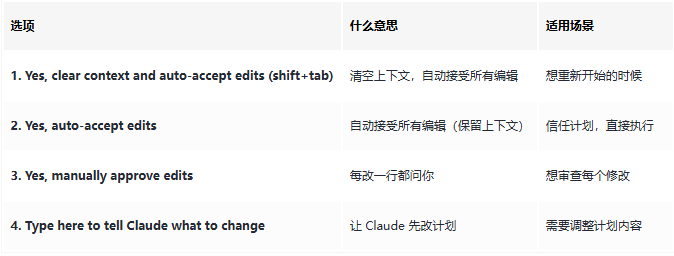 💡 小技巧:我一般会选 4,然后输入:"先把计划保存到 plan.md,我们再继续"。这样方案留底,后面出问题了还能回溯。等保存完了再选 2 让 Claude 自动执行。
