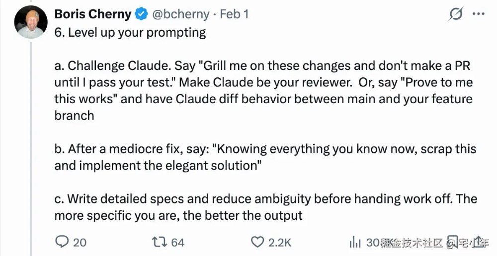Claude Code 创始人 Boris Cherny 在 X 上分享过团队内部的使用心得。挑几个我觉得特别实用的: