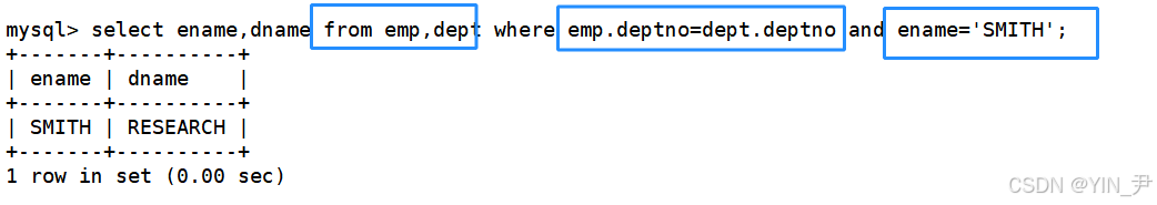 select ename,dname from emp,dept where emp.deptno=dept.deptno and ename='SMITH';