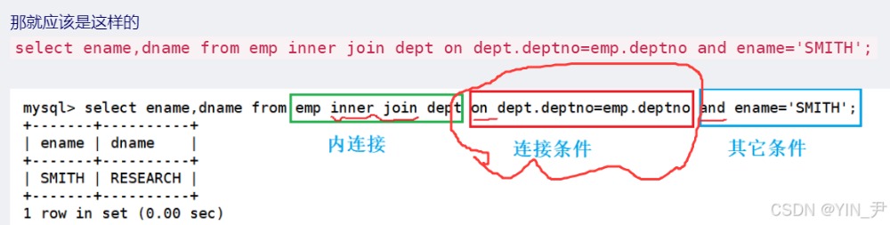 select ename,dname from emp inner join dept on dept.deptno=emp.deptno and ename='SMITH';