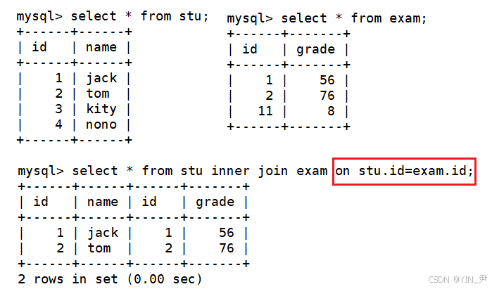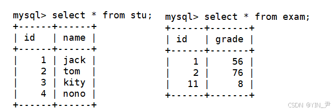 stu表中id值3,4和exam表中id值11。两张表都有id这个属性,但是这几个值在另一张表中找不到相等的值。