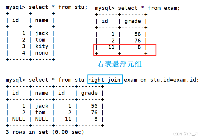 select * from stu right join exam on stu.id=exam.id;