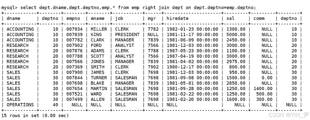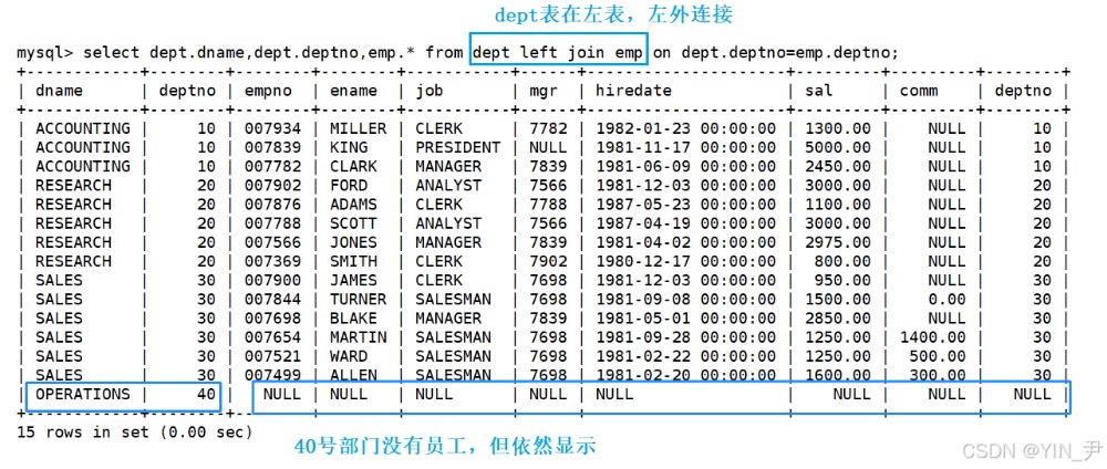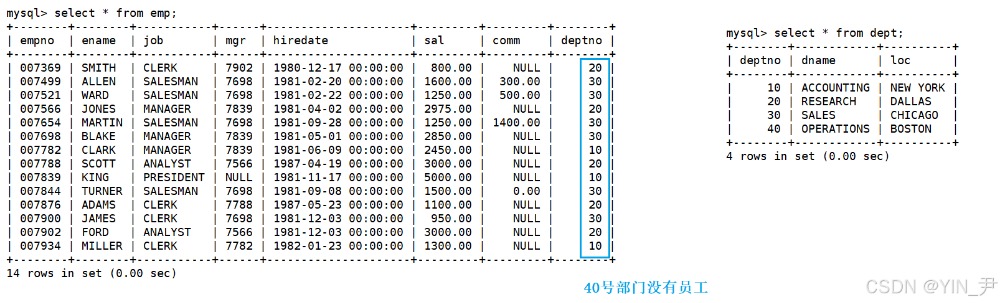 会发现40号部门是没有员工的,如果内连接(笛卡尔积+过滤条件——两表的deptno相等)