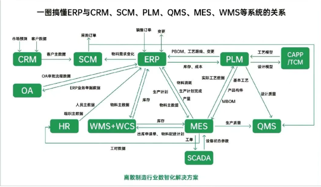 但现在市面上的很多“ERP软件”,其实只是个打着名号的工具,功能缺漏、逻辑混乱,有的甚至连最基本的数据都捋不顺,更别提实现资源协同了。 所以我们说,ERP这个理念不过时。过时的,是那些把ERP当成卖报表、套流程的模板工程,做不到深入企业实际,只停留在表面操作的“伪ERP”。 二、ERP和其他管理系统的关系在管理软件类别上,除了ERP,还有CRM、PLM、OA、WMS、MES、OMS等等,它们之间又是什么关系呢? 其实ERP是“管全局”的系统,而MES(生产执行)、WMS(仓储管理)、CRM(客户关系)等,是“专业模块”系统。