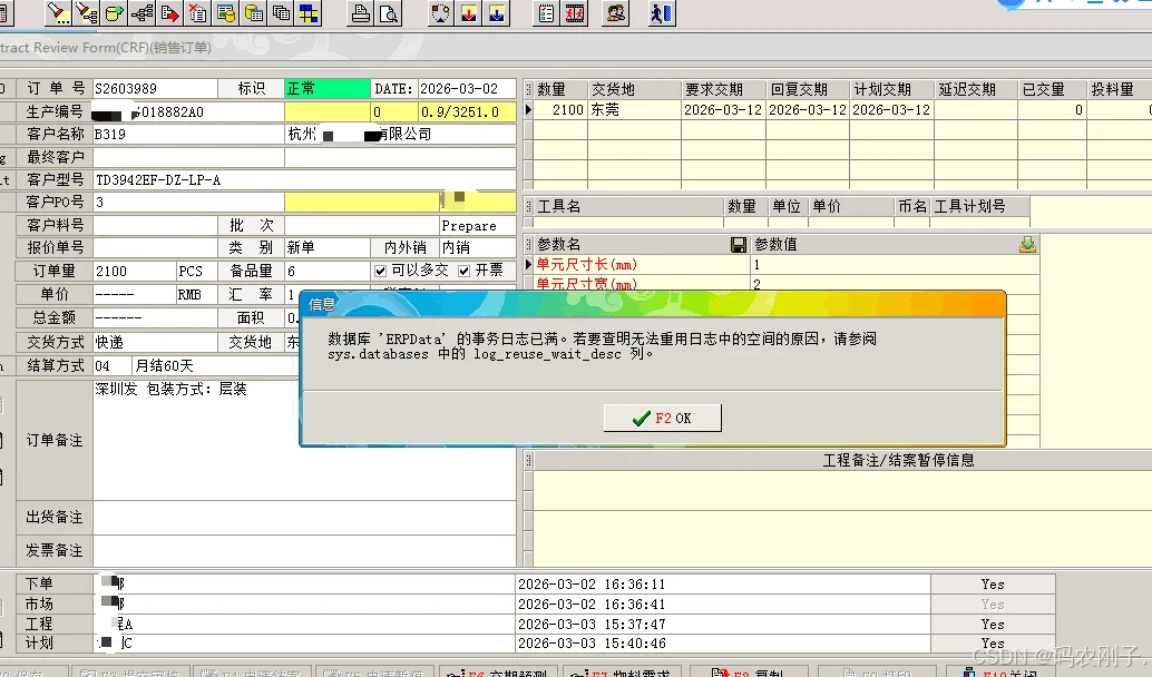 现象:所有功能界面操作长时间无响应,提示:数据库'ERPData'的事务日志已满。若要查明无法重用日志中的空间的原因,请參阅sys.databases 中的 log_reuse_wait_desc 列。