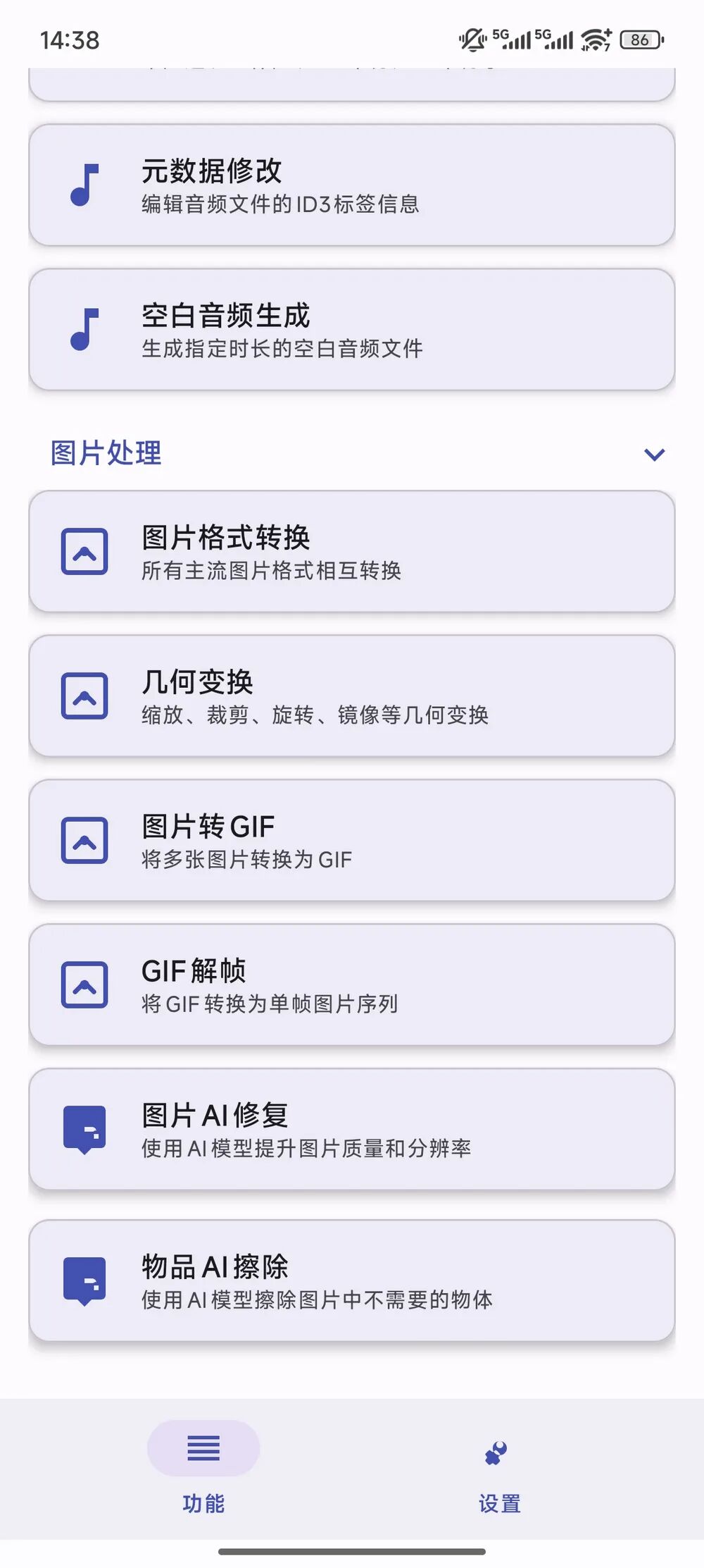 格式与几何变换:自由转换图片格式,支持缩放、裁剪、旋转、镜像等多种几何调整,适配不同使用场景; AI修复:一键修复老旧照片,还原清晰细节,留存珍贵回忆; 创意优化:支持擦除图片中的多余物体,比如照片里的路人、杂物,让画面更干净。 图片功能其实差点意思,现在的手机基本都自带这些,但集成在一起也算方便吧。进阶玩法