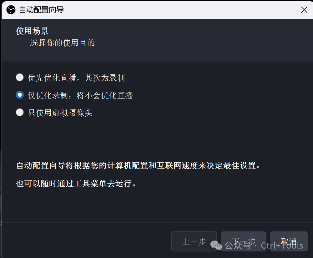 都离不开一款强大的工具。 今天要推荐的工具是一款开源且免费的专业级直播与录屏软件OBS,支持 Windows、macOS、Linux 等多个主流操作系统,。 提供了一整套全面且强大的功能,涵盖直播、录屏、多画面管理等多个关键维度,满足了不同用户在各种场景下的多样化需求! 工具下载链接:https://obsproject.com/zh-cn ![]() 核心优势: 1.多场景录屏:支持全屏录制,也支持指定程序窗口录制,更支持多源同时录制。 2.高质量推流:支持多平台低延迟模式直播。 3.音频处理:多音频源独立调控(麦克风/游戏声/背景音乐) 4.特色功能:开源软件生态好,海量便捷功能插件扩展。 OBS专业级录屏功能入门使用指南下载后必设置的功能1.自动配置向导 直播优先选“优先优化直播,其次为录制” 录制优先选“仅优化录制,将不会优化直播” 没想好可以点取消,可以随时通过菜单中的“工具”->“自动配置向导”打开。(因为本篇先介绍录制功能,下面是优先录制设置)