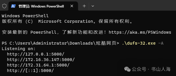 或者在软件目录下打开Windows命令行工具,输入.\dufs-32.exe -A 即可,具体使用方法在后续。