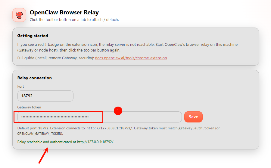 保存成功,提示:Relay reachable and authenticated at http://127.0.0.1:18792/,说明已连接到本地的中继服务