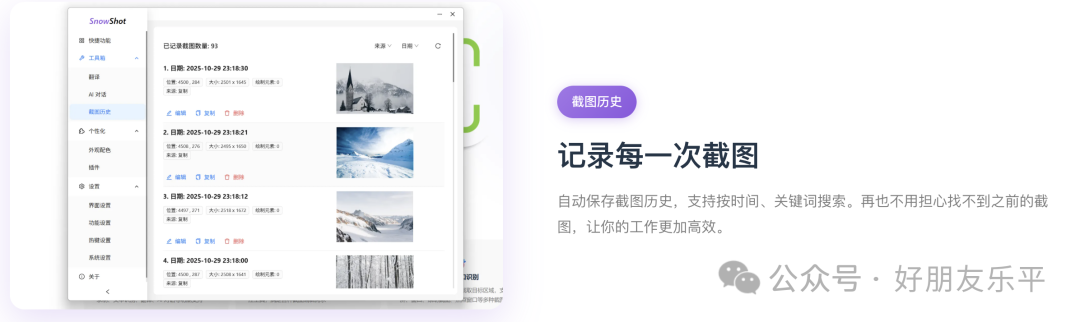 这个功能简直是我的救星!以前用其他截图工具,截了图如果忘记保存,那就彻底找不回来了。Snow Shot会自动保存所有截图历史,还支持按时间和关键词搜索。