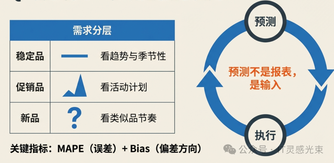 供应链管理到底在管什么? 供应链管理(SCM)本质是:围绕客户服务目标,把需求变成供给,并在成本与现金约束下稳定兑现承诺。 它管理的对象不是某个部门,而是端到端链路: 需求(预测/订单) → 计划(S&OP/MPS/MRP) → 供应(采购/生产/外协) → 库存(在制/在途/可用) → 履约(仓配/运输) → 回款(对账/开票/收款) 所以供应链的核心矛盾永远是四个字:“准、快、省、稳”
