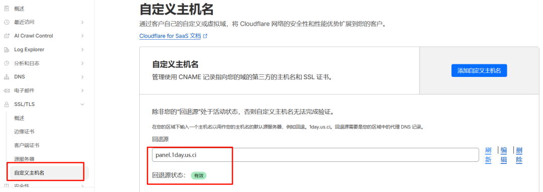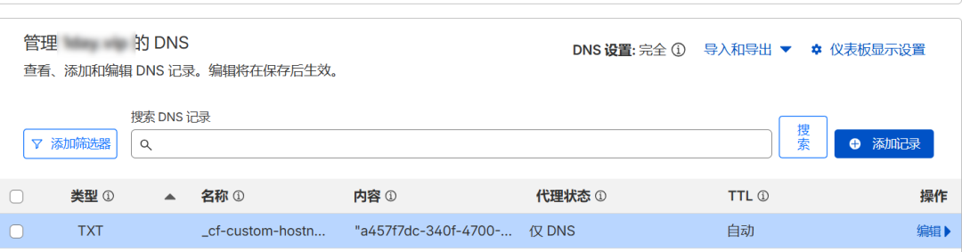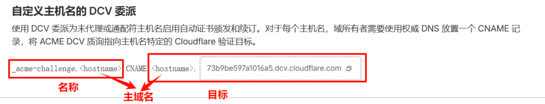11. 添加自定义主机名的 DCV 委派,实现证书自动续费 主域名新建cname解析,名称和值填写如下