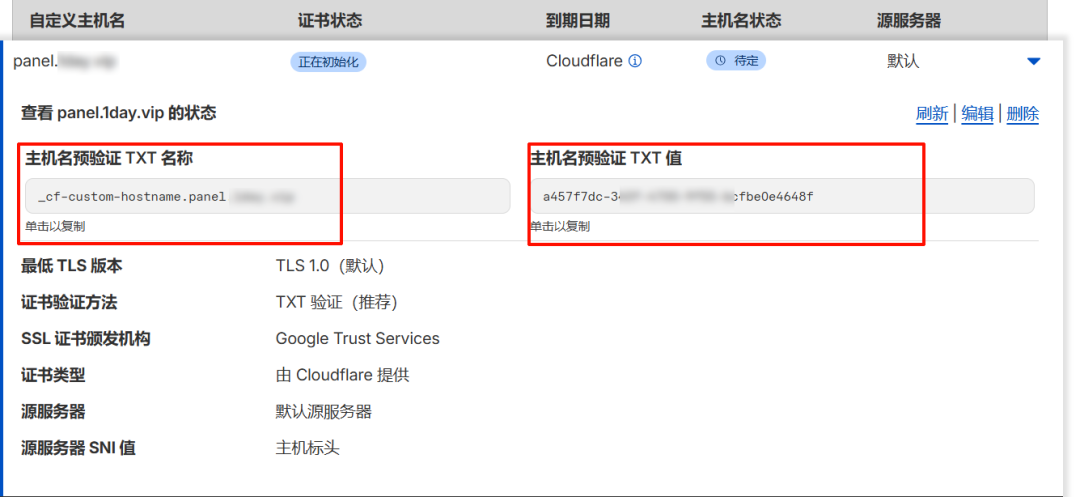 7. 查看自定义主机名状态,复制于验证txt名称及值