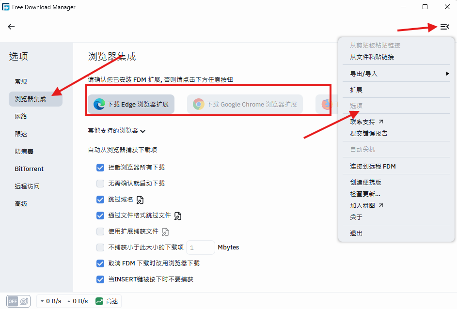 打开FDM,找到右上角菜单里的选项,里面有个浏览器集成的选项卡。点击要安装插件的浏览器,它会提示你安装一个浏览器扩展。