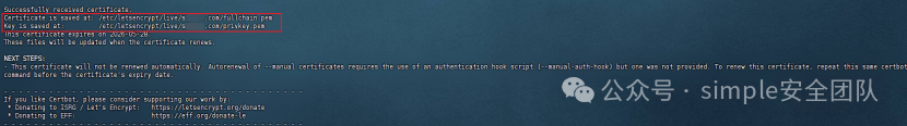 通配符证书必须通过DNS验证方式申请,因为Let's Encrypt需要验证您对域名的控制权。1、执行以下命令开始申请通配符证书,执行完之后不要点击Enter键,要等确定TXT记录生效之后才能点击Enter键:sudo certbot certonly --manual --preferred-challenges=dns \ --server https://acme-v02.api.letsencrypt.org/directory \ --agree-tos -m your-email@example.com \ -d '*.simple.com' -d simple.com