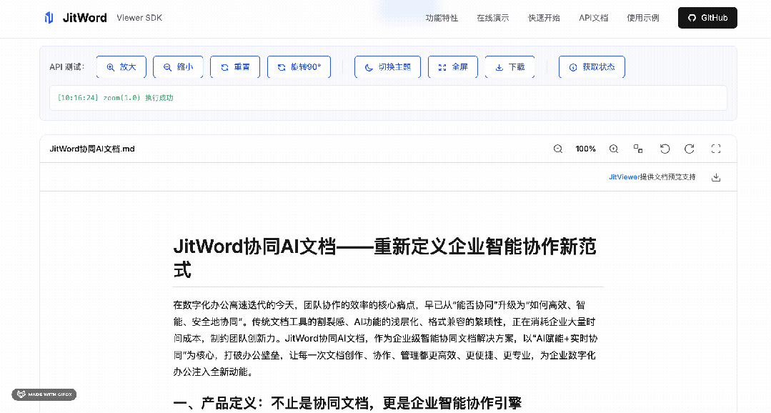 它是一个纯前端文件预览SDK,支持 Word、Excel、PPT、PDF 四大主流格式(当然我们也支持了Markdown, TXT格式的预览),同时对 Vue/React/Angular/Svelte 全框架兼容,无需后端转换,浏览器能直接渲染。大家可以把这个 sdk 轻松集成到任何系统,并实现文件的一键预览,目前项目已开源:github:https://github.com/jitOffice/jit-viewer-sdk国内镜像:https://gitee.com/lowcode-china/jit-viewer演示地址:https://jitword.com/jit-viewer.html