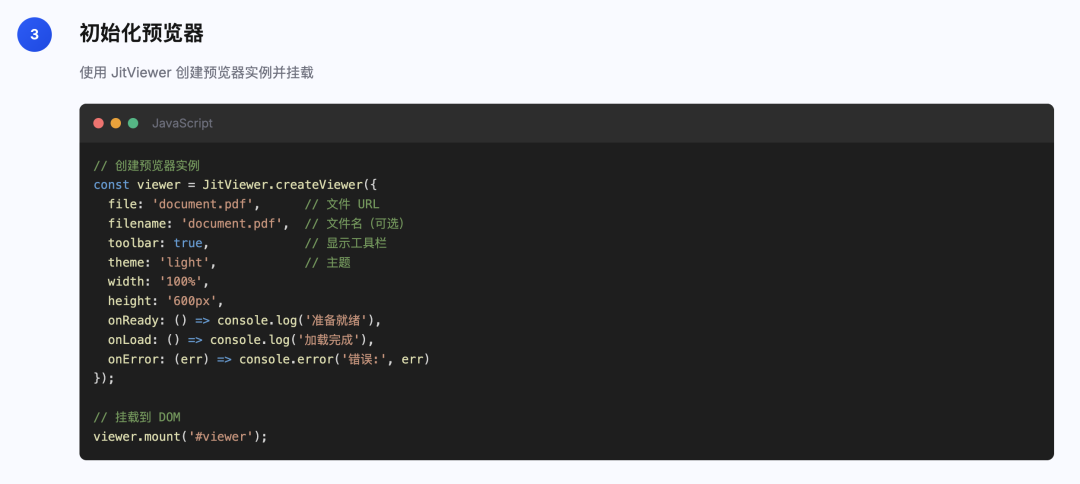 我在 jit-viewer 文档中写了详细的使用教程,并提供了完整的API,下面给大家分享一下:没错,就只需要上面的3步,就能轻松把sdk集成到项目。如果大家想看详细的文档演示和API介绍,可以参考我们的线上文档: