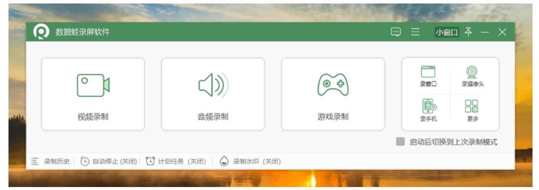 步骤2.首先启动数据蛙录屏软件,进入主界面后,屏幕录制、游戏录制、直播录制等多种录制模式一目了然。若是需要录制教程、影视片段这类普通视频,直接选择屏幕录制模式即可。