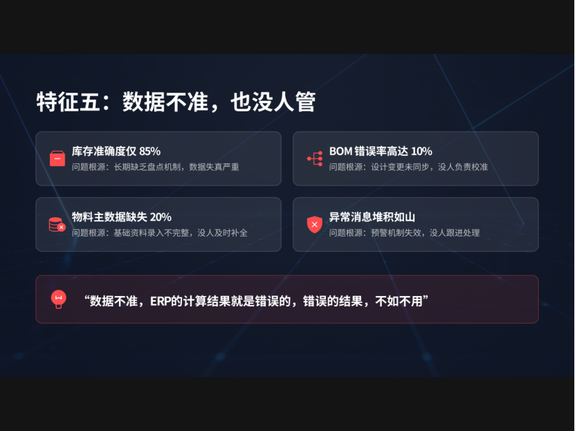 库存准确度只有85%,但没人去盘点;BOM错误率10%,也没人校准;系统提示很多异常消息,也没人去处理。