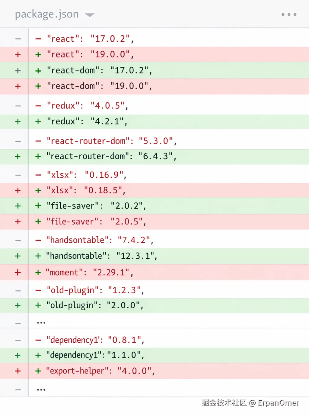 我点开 package.json 的 diff,好家伙,红绿相间的变动多达七十多处。除了 React 自身的跨代大版本,连带着状态管理、路由、甚至底下好几个用来处理复杂 Excel 导出的老旧插件,全被强行 npm update 到了最新版。