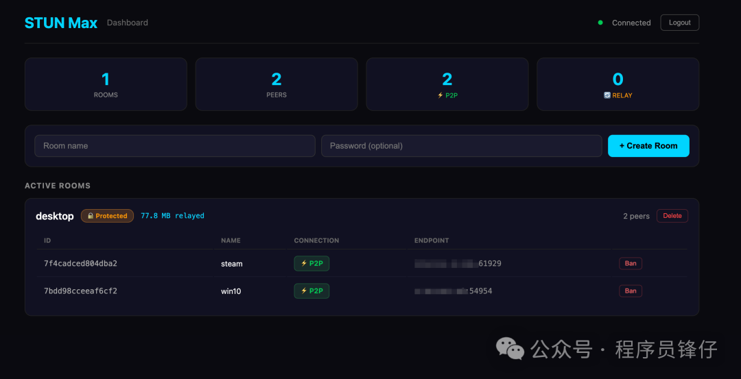 防火墙设置: 开放 TCP 8080 和 UDP 3478 端口。 2. 创建房间打开 http://SERVER:8080,登录,创建一个带名称和密码的房间。 房间会一直存在,直到被明确删除,即使客户端断开连接或服务器重启也不会消失。 3. 连接客户端GUI 版(Windows/Mac): 运行 stun_max-client-windows-amd64.exe 或 stun_max-client-darwin-arm64,填写服务器 URL、房间、密码和名称,点击连接。 CLI 版: