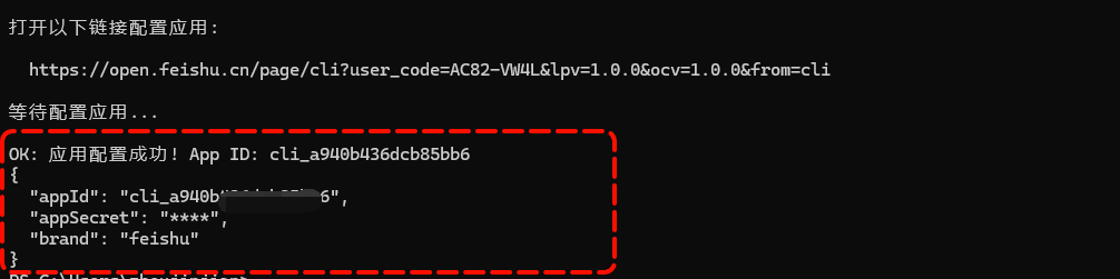 最后,我们来验证检查一下状态: 如果能正确获取飞书用户信息,以及刚创建并开通的App应用信息,则说明安装成功。