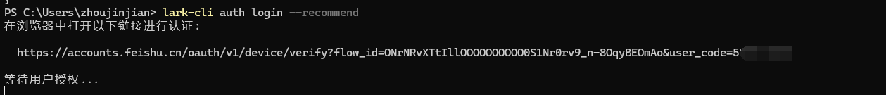 第二步:配置与使用在命令行终端,运行此命令,命令会输出一个授权链接,提取该链接并发送给用户,用户在浏览器中完成配置后命令会自动退出。