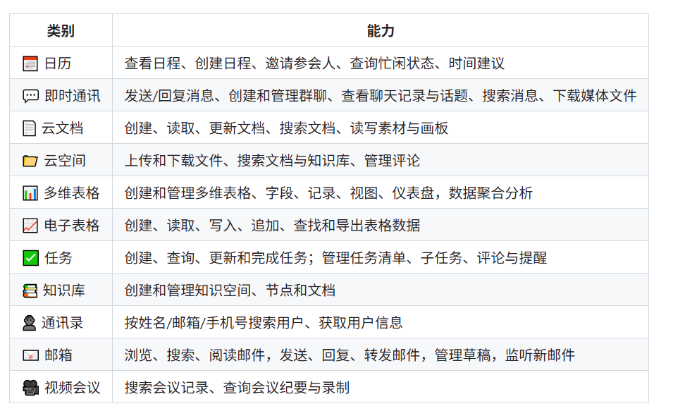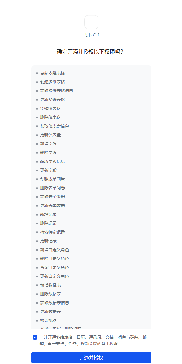 至此,你就可以在 这时候,一定、一定、一定记得重启一下你的Claude Code、Codex、OpenCode等等Agent产品! 这不是装个Skill热重载就可以用了,记得重启。 目前,飞书CLI支持这些功能操作权限。