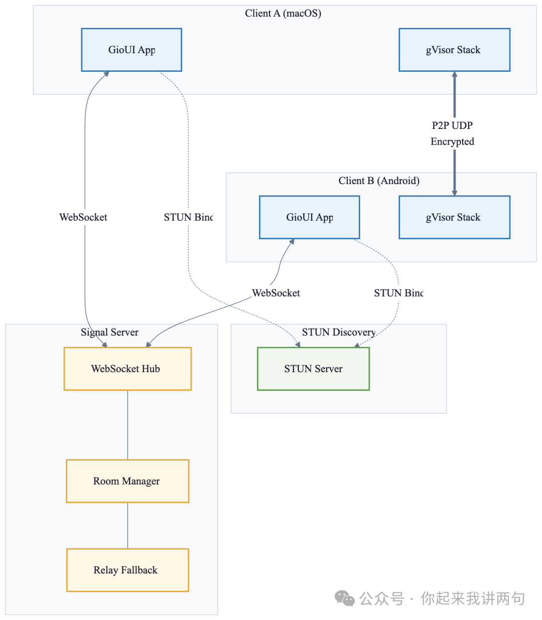 所以我决定自己动手。目标很简单:P2P 优先、连不上就自动回退到服务器中转、所有平台都能用。 系统架构:信令 + 打洞 + 隧道