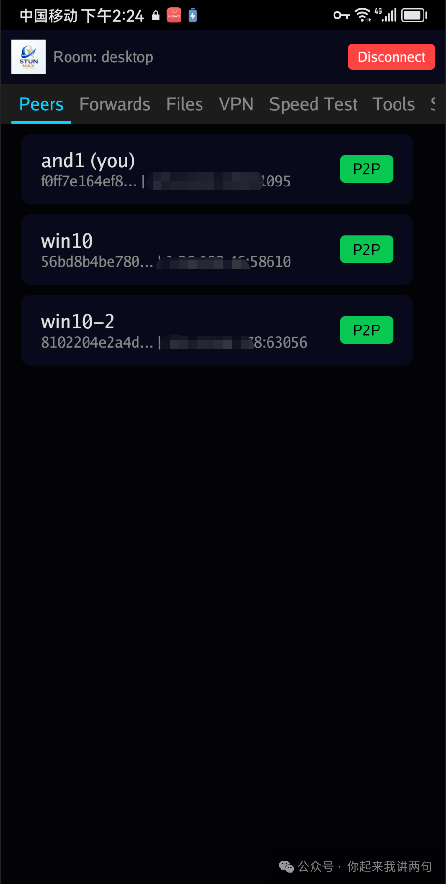 ▲ Peers 节点发现 Forwards 端口转发 把远端服务的端口映射到本地。支持同时转发多个端口,一键启停。