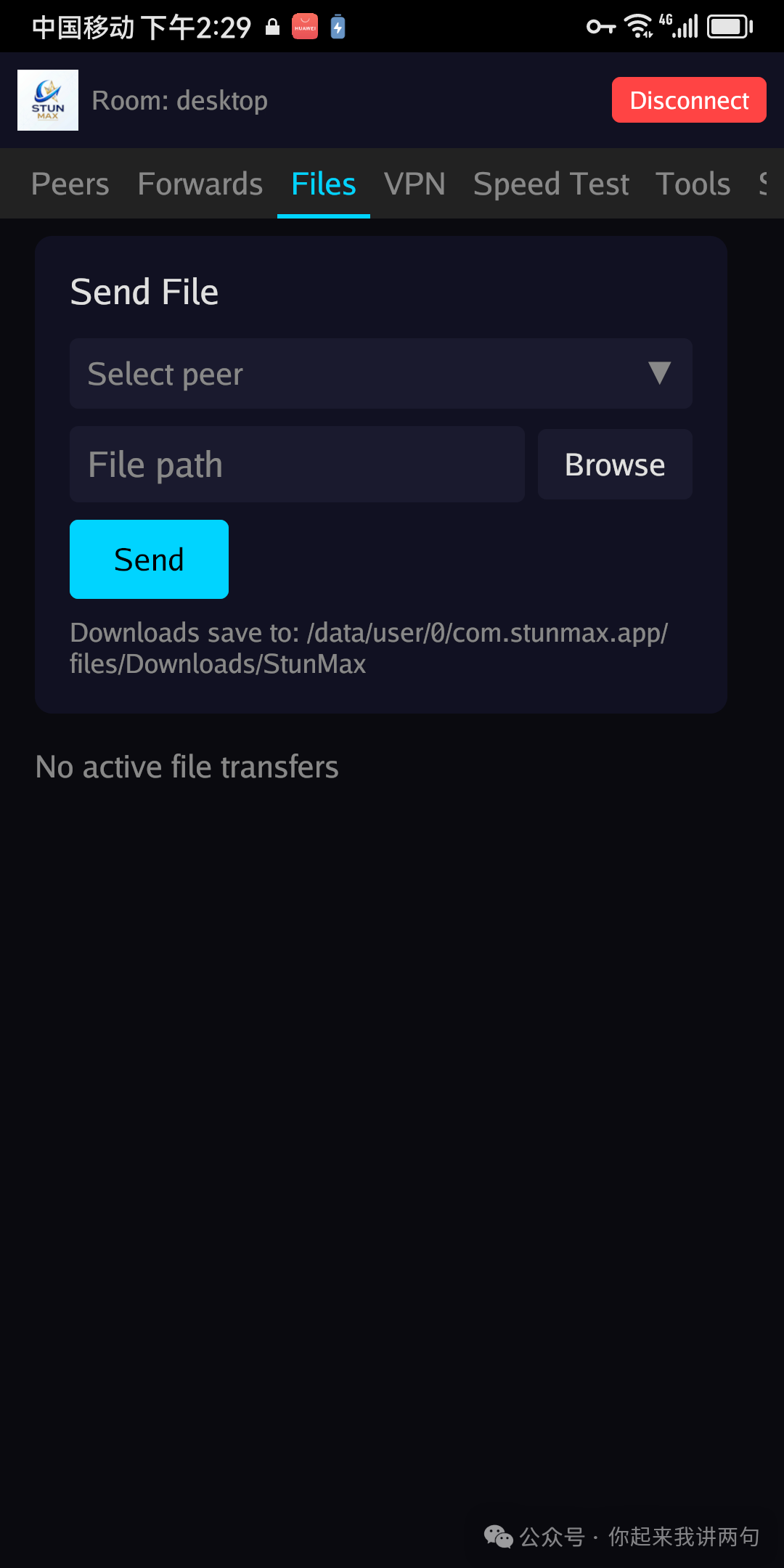 ▲ Forwards 端口转发 Files 文件传输 基于 gVisor TCP 流式传输,P2P 优先。支持拖拽文件、自动接受、进度显示。
